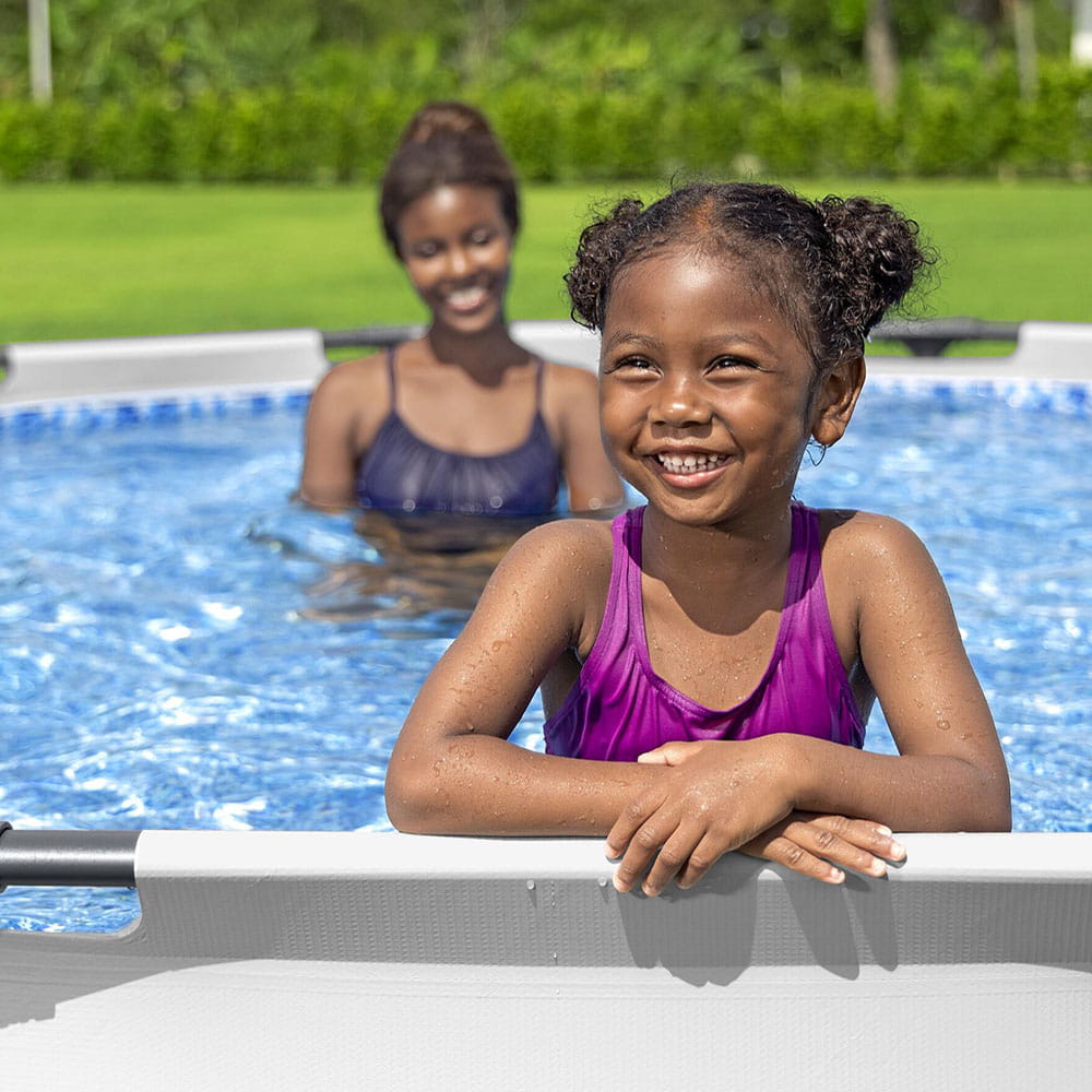 Завдяки збільшеному розміру, басейн вміщує 6 473 літри води. Чаша виготовлена з тришарового матеріалу DuraPlus™, який стійкий до проколів та впливу ультрафіолету. Посилений сталевий каркас забезпечує стабільність конструкції, навіть якщо діти активно граються у воді.