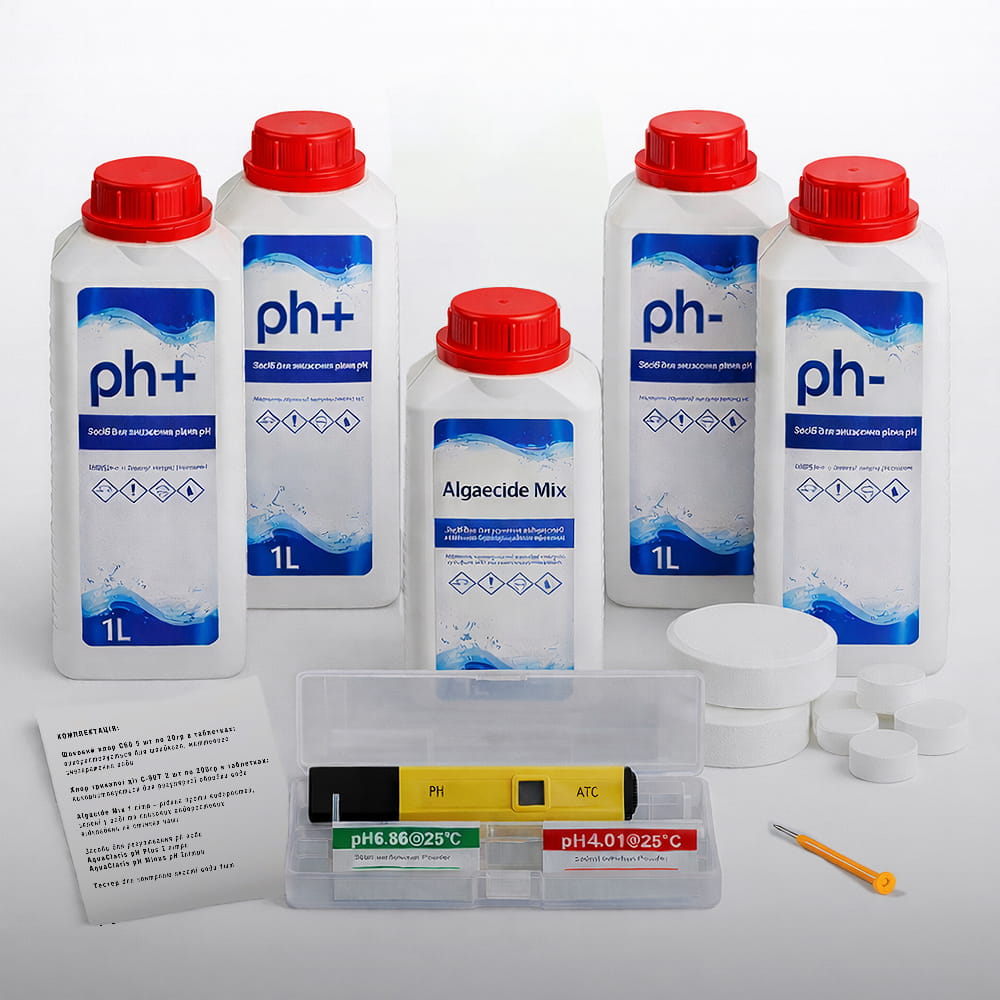 Баланс pH (AquaClaris pH Plus 2л та pH Minus 2л) — повний набір для вирівнювання кислотно-лужного балансу. Це критично важливо для того, щоб хлор працював ефективно, а вода не подразнювала очі.