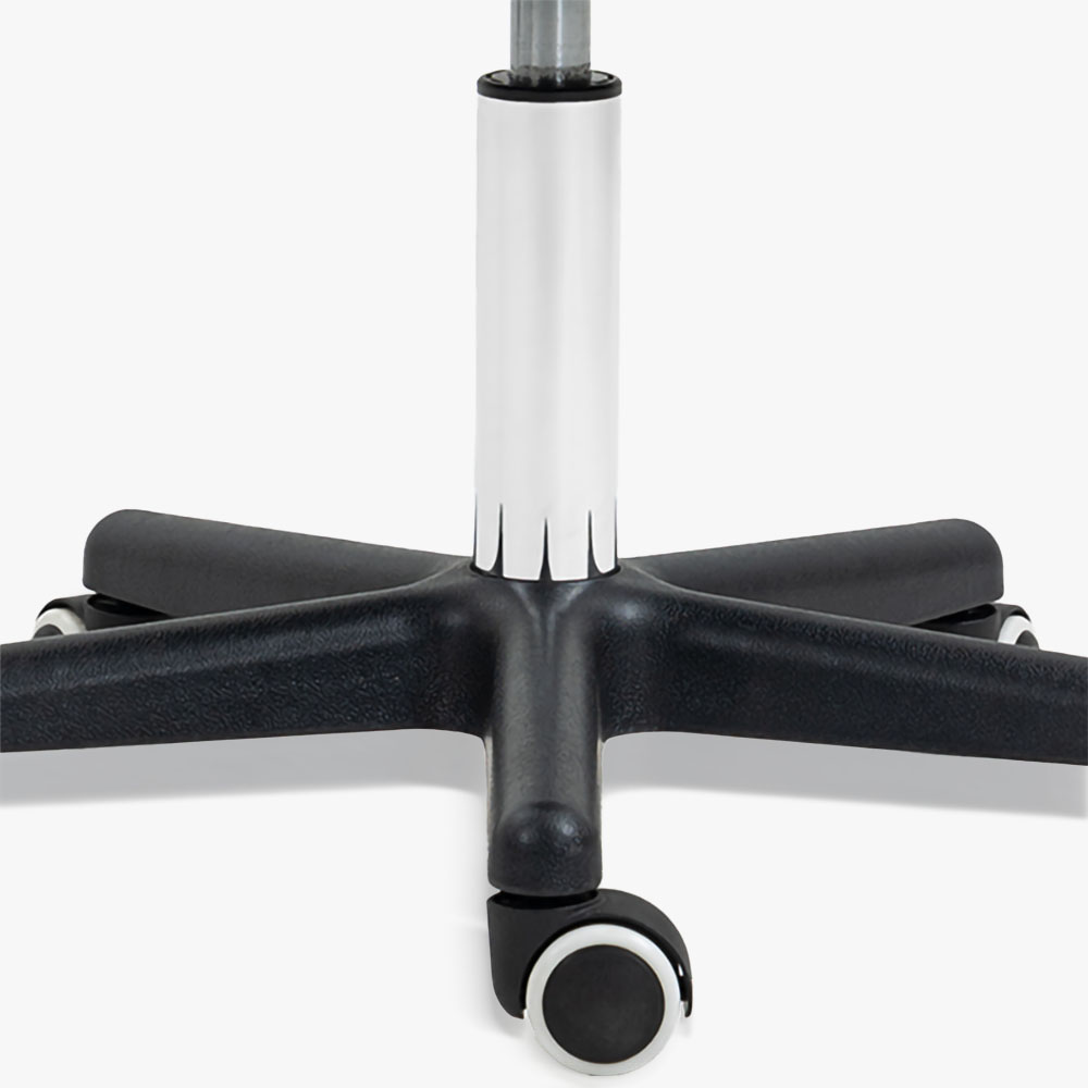 Стілець має металеву основу з п’ятьма спицями, що забезпечує рівновагу й стійкість. Колеса не дряпають підлогу, а механізм регулювання висоти дає змогу легко підлаштувати положення під власні потреби.