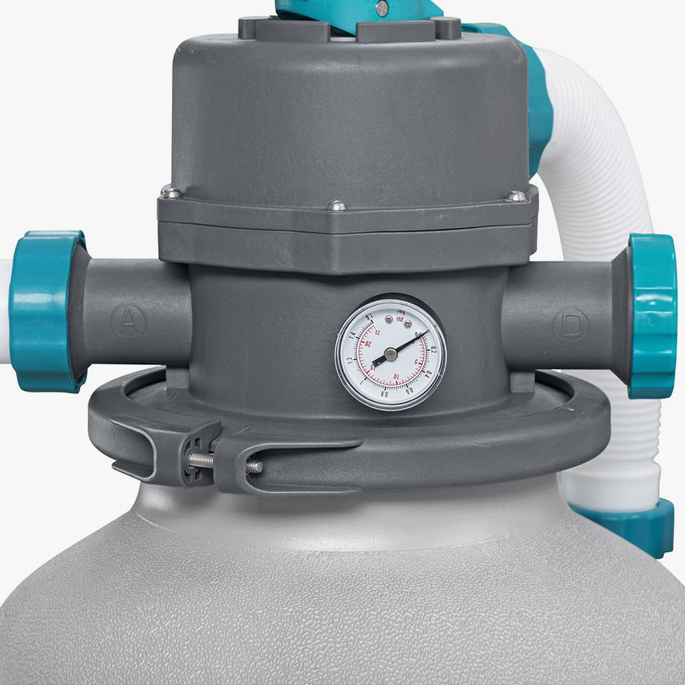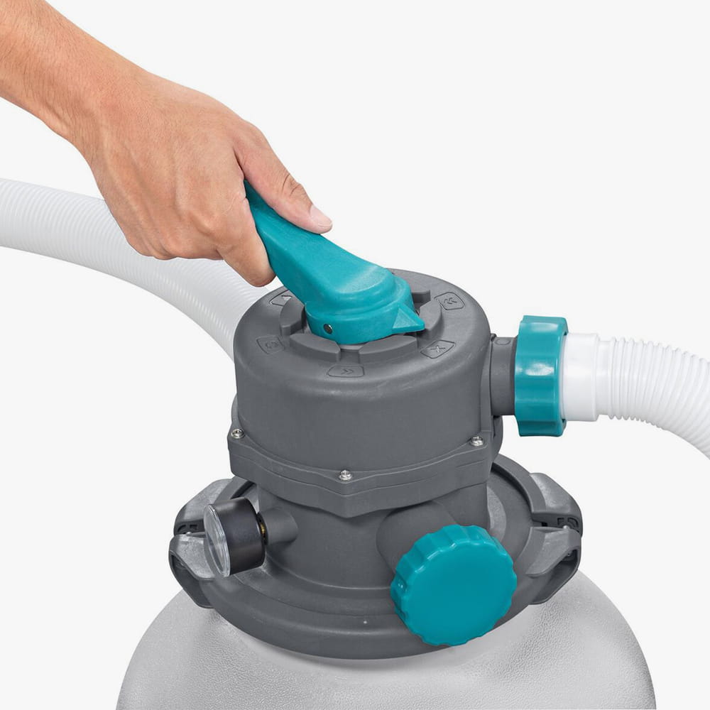 6-позиційний клапан: Зручна ручка перемикання режимів дозволяє легко керувати всіма процесами: фільтрація, зворотна промивка (очищення піску), полоскання, злив води, циркуляція та повне закриття системи.