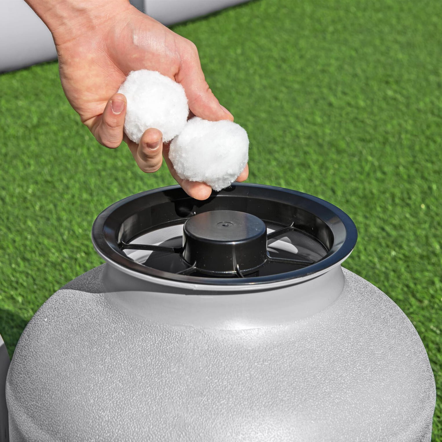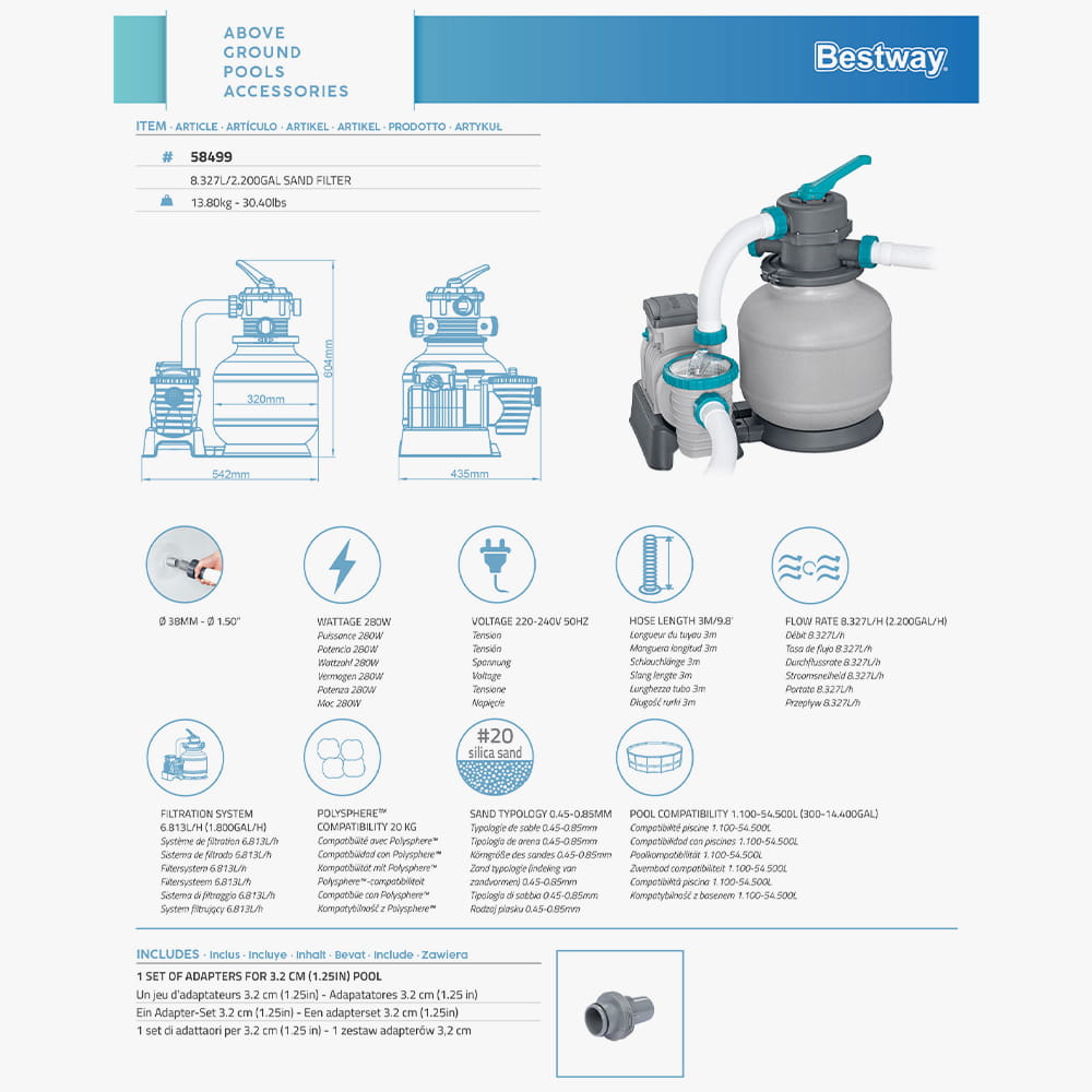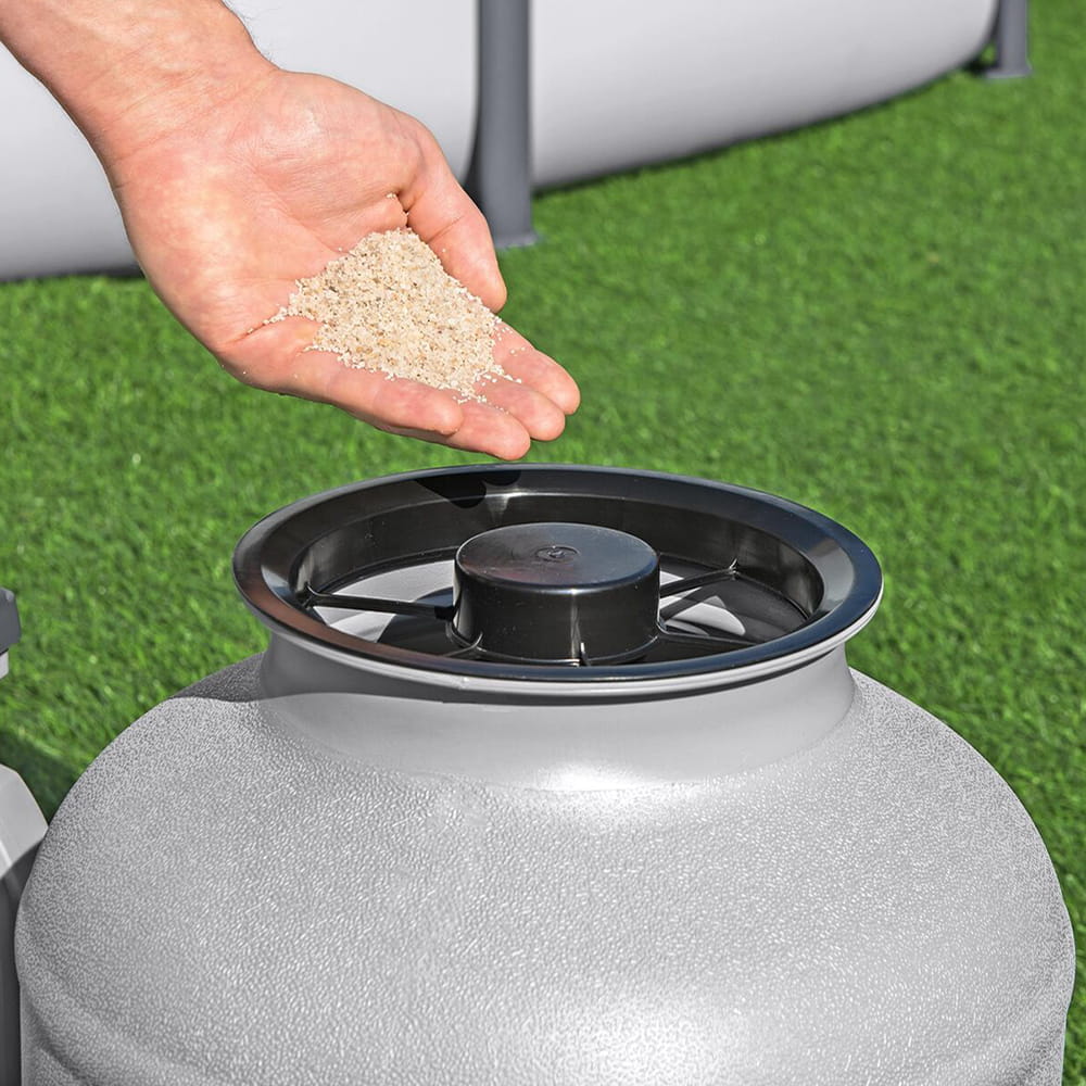 | Фільтруючий елемент (не входить до комплекту) | Кварцовий пісок №20 (0.45-0.85 мм) — приблизно 20 кг або Фільтруючі кульки Bestway Flowclear™ Polysphere (500 г) |