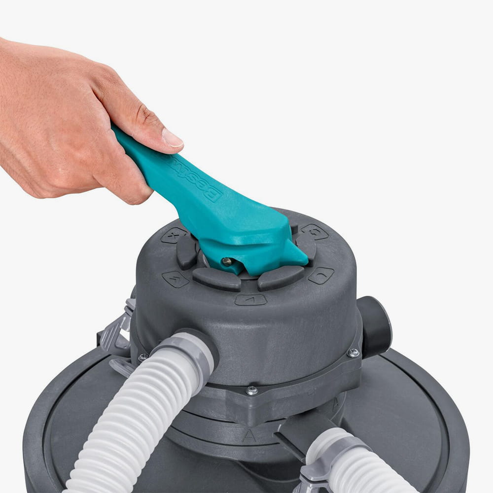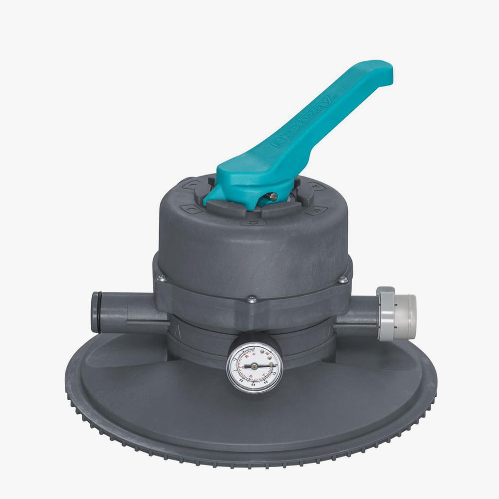 Багатофункціональний клапан (6 позицій): Зручна ручка дозволяє миттєво перемикатися між режимами: фільтрація, закриття, зворотна промивка (очищення піску), полоскання, злив та циркуляція.