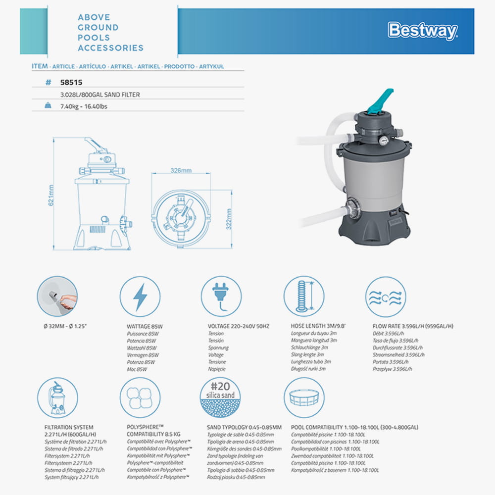 Зробіть догляд за басейном простим та ефективним! Bestway 58515 — це потужний пісочний фільтр, який забезпечує якісне очищення води, працює значно довше за картриджні аналоги та є більш екологічним рішенням для вашого відпочинку.