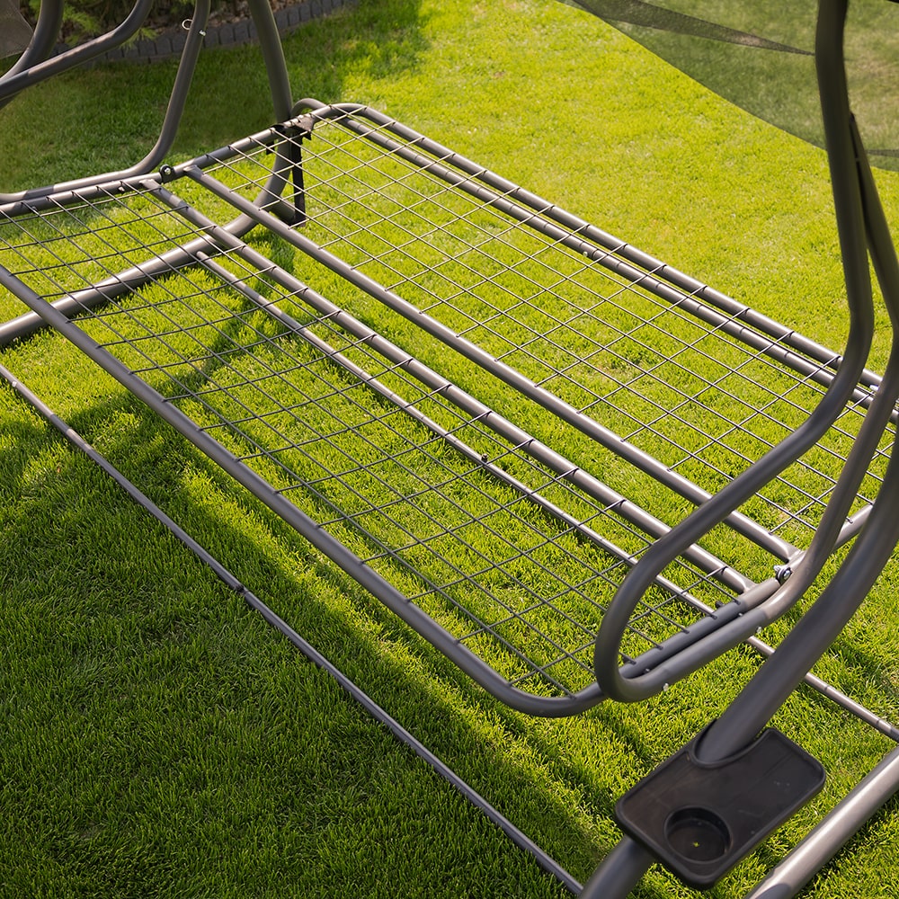 Гойдалка створена для 4 осіб, а москітна сітка ефективно захищає від комах, дозволяючи насолоджуватись вечірнім відпочинком без дискомфорту. Зручні подушки додають комфорт, а регульований навіс дарує тінь у спекотні дні.
